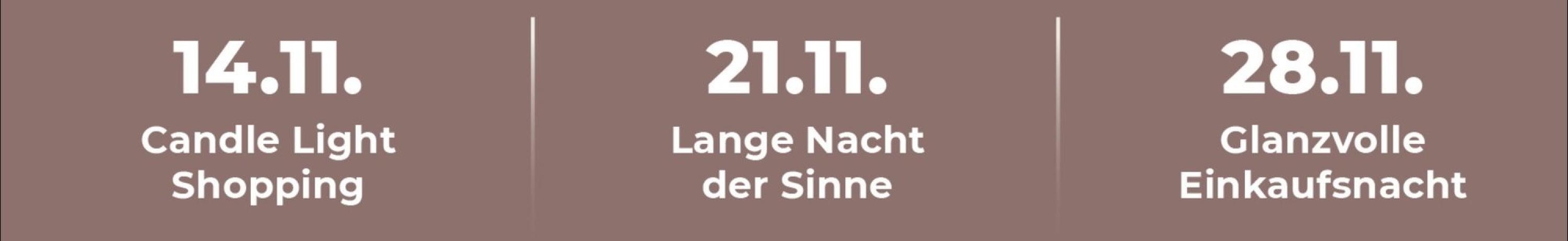 An drei aufeinanderfolgenden Freitagen haben wir bis 20.30 Uhr geöffnet und laden Sie ein, in stimmungsvoller Atmosphäre zu genießen, zu entdecken und sich inspirieren zu lassen.